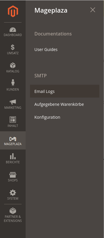Die Erweiterung „Mageplaza SMTP“ bietet eine Funktion, mit der von System versendete Mails gespeichert werden. Diese gespeicherten Mails können über den Email Log abgerufen werden.