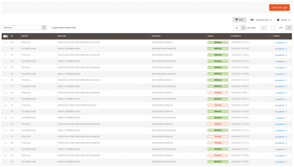 Es öffnet sich die Liste aller vom System gespeicherten Emails. Neben Informationen zu Betreff und Empfänger der nachricht, wird auch ein Status angezeigt. Die meisten Nachrichten hier sollten als „Erfolg“ gelistet werden. Häufige „Fehler“ deuten auf eine falsche Konfiguration der SMTP Zugangsdaten hin. Einzelne Fehler können z. B. auftreten, wenn ein Benutzer eine ungültige Email Adresse eingegeben hat und die Mail dadurch nicht zugestellt werden konnte.